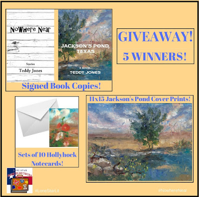 One Grand Prize: Signed copies of both Nowhere Near and Jackson’s Pond, Texas, set of 10 hollyhock notecards, and a 11×15 print of the cover art from Jackson’s Pond.